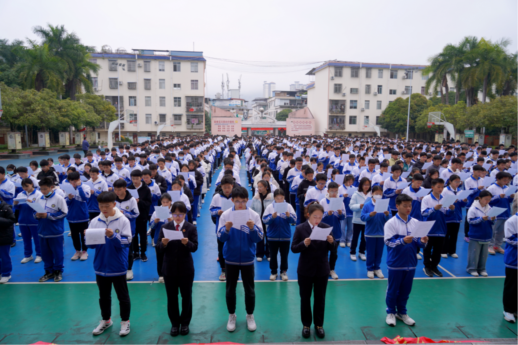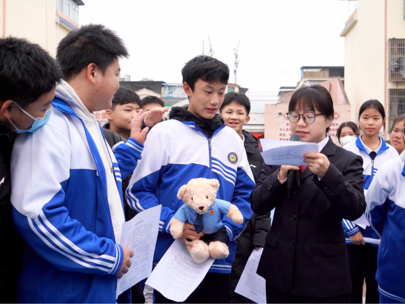 法治阳光润校园,青春与法共成长。为引导青少年树立正确的宪法观念,扣好人生“法治扣子”,我院组织检察人员走进富宁县民族中学,全程参与学校升旗仪式。升旗仪式上,检察人员们与全校师生一同肃立致敬,聆听国旗下的法治讲话,感受宪法与国家、个人的紧密联系。随后,同师生们进行千人诵读宪法活动,共同诵读宪法核心条款,在琅琅书声中感悟宪法的庄严与神圣。此外,检察干警还精心设计宪法知识竞答环节,围绕宪法基本原则、公民基本权利与义务等内容设置考题。“我要检察小熊、我要回答问题、这题我会”……同学们踊跃参与、积极抢答,现场气氛热烈。竞答活动以赛促学,有效激发了青少年学习宪法知识的积极性和主动性,让宪法知识在互动中入脑入心。